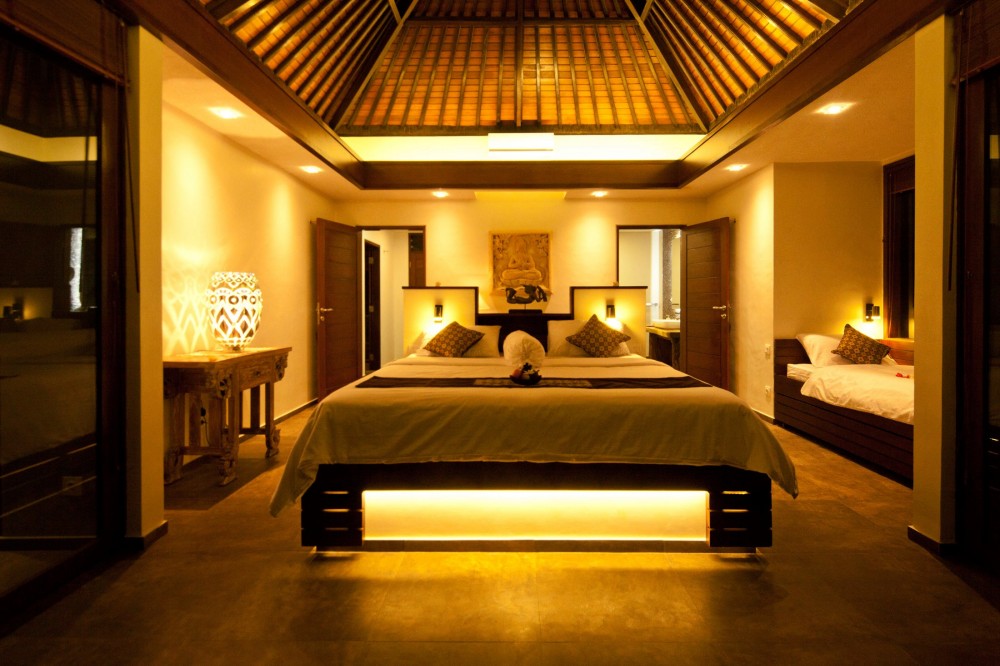 Každá vila má dvě oddělené klimatizované ložnice s velkou pohodlnou manželskou postelí ( 220 x 200 cm). Každá ložnice má také samostatné velké lůžko ( 200 x 100 cm). Celková kapacita vily je až 6 osob. Ložnice jsou odděleny prostorným obývacím pokojem s kuchyňským koutem a terasou. Ke každé ložnici patří prostorná šatna a koupelna se sprchou a WC.